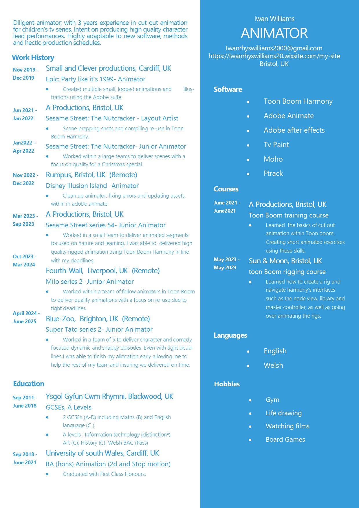 Hi i'm Iwan!I'm currently a remote animator on Supertato s2 for Cbeebies. I specialise in 2d rigged animation, though I am also proficient at traditional animation.In furthering my skills and software knowledge, I took Sun & Moons Toon Boom rigging course. As understanding how rigs are built makes it easier to animate them and to fix any issues that may occur.During my free time I enjoy exercising, going to gigs and watching filmsWilling to relocate if needed.